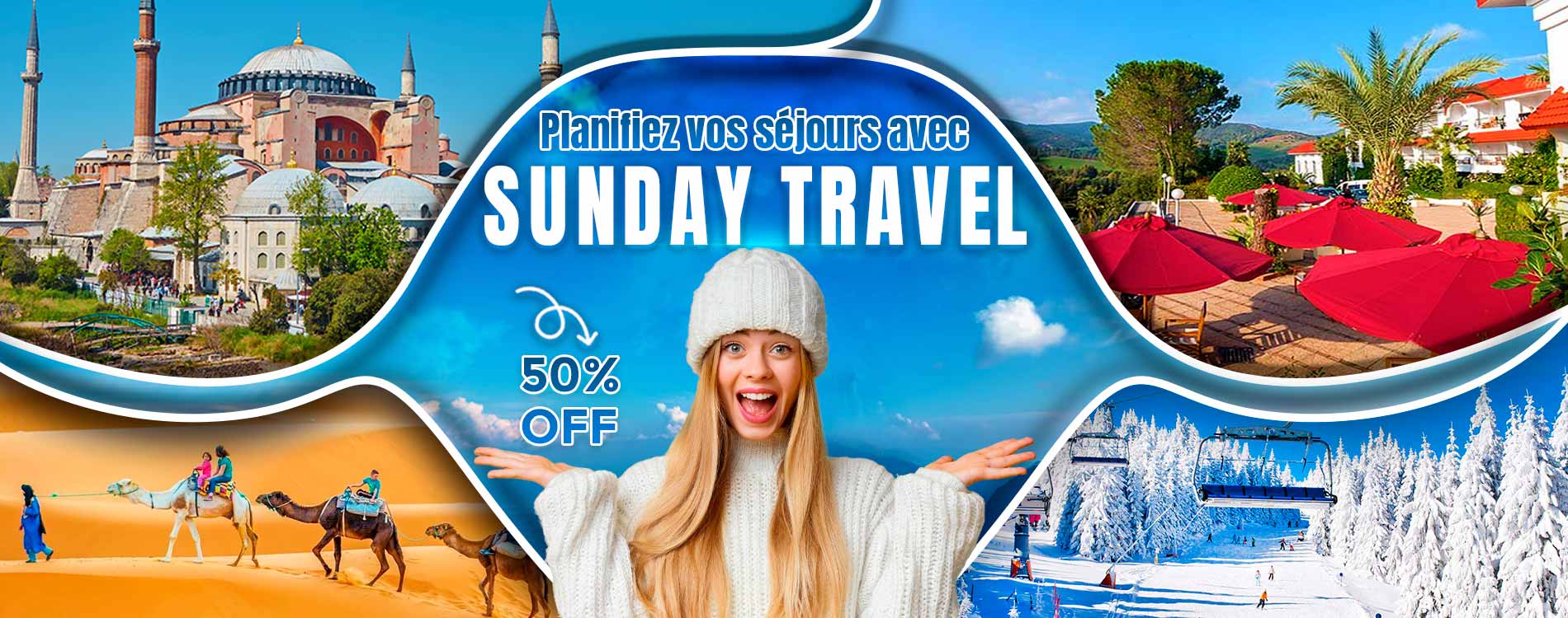 - Sunday Travel , votre Agence de Voyage en Tunisie en Ligne vous propose des Promotions sur vos Voyages et Séjours en Tunisie et dans le Monde avec les Meilleurs Prix et Services.